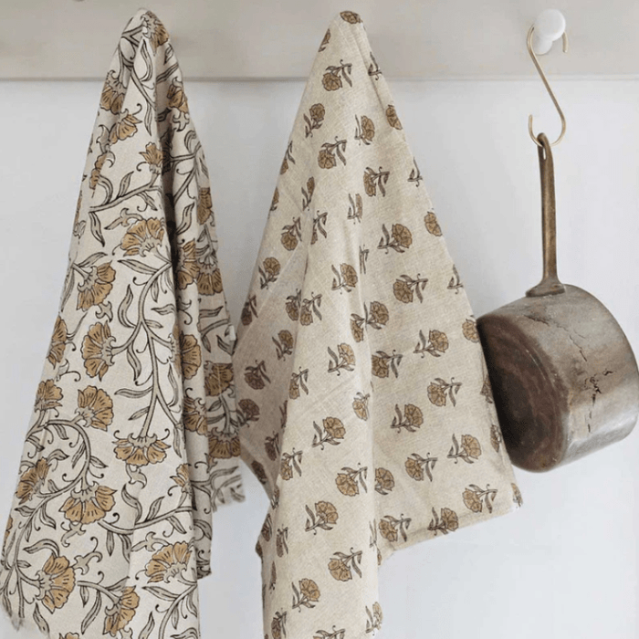 Bring the warmth of an English cottage into your home with this beautiful set of two block print tea towels. Featuring rich mustard-colored floral motifs on a soft flax-toned background, these towels offer a rustic, old-world charm perfect for cozy kitchens and country-inspired spaces.