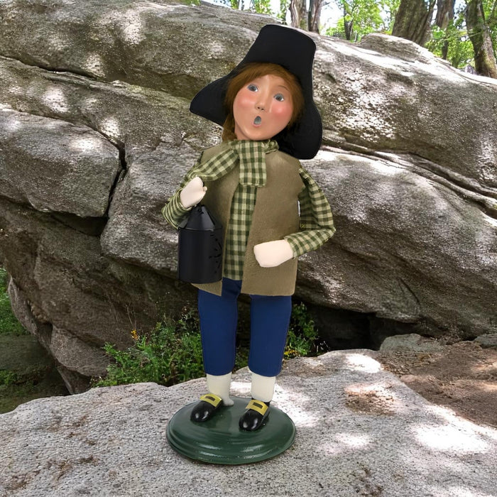 This charming Colonial-era boy is dressed for a day in town, holding a lantern to light his way. His classic outfit and period-inspired accessories reflect the timeless traditions of early American life. A wonderful addition to any historical or seasonal display.