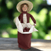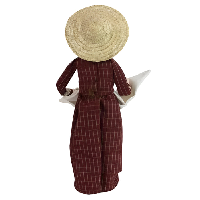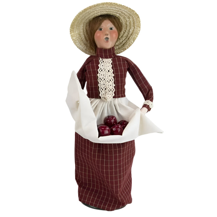 This charming handcrafted figure features a woman holding apples, dressed in classic layered winter attire. Her expressive face and detailed clothing showcase the signature artistry of Byersā Choice. A delightful addition to any display.