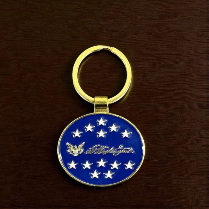 Celebrate leadership and legacy with this striking Commander in Chief key chain, inspired by George Washington’s role as the first Commander in Chief of the Continental Army. This elegant accessory features a rich blue enamel background, accented with 13 stars representing the original colonies, a gold eagle emblem, and Washington’s signature in brilliant gold-tone detail.