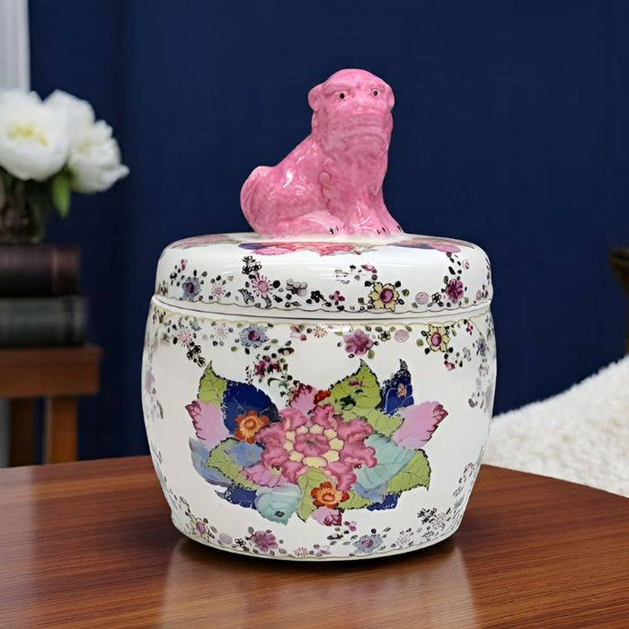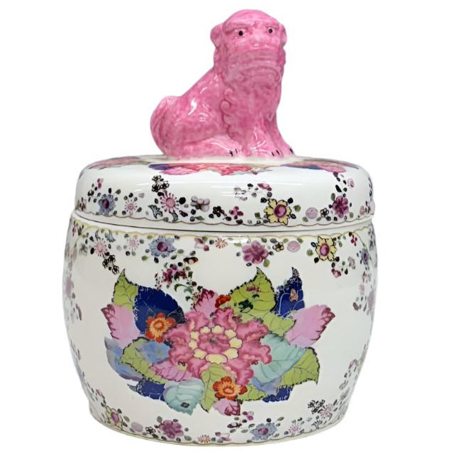 This exquisite ceramic jar showcases a vibrant tobacco leaf pattern in rich, traditional colors and is crowned with a striking pink Foo Dog lid. A beautiful blend of elegance and heritage, it brings a touch of timeless charm to any bookshelf, side table, or entryway display.