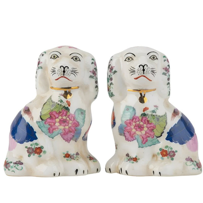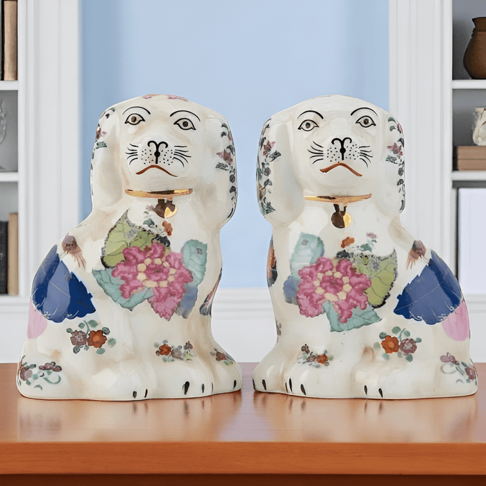 Add a refined touch to your space with this charming pair of mini Staffordshire dogs. Handcrafted with intricate detail and adorned in a vibrant tobacco leaf pattern, they offer a timeless elegance in a petite size.