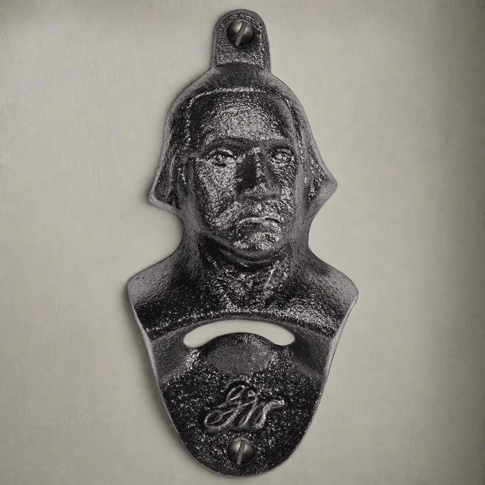This Mount Vernon exclusive iron bottle opener is designed to be mounted on the wall, adding both style and function to your kitchen or bar. Crafted from a replica of George Washington’s head and featuring his iconic "GW" initials, this sturdy wall-mounted opener offers a historic touch while ensuring easy and convenient bottle opening. Made from durable iron, it is designed to be securely screwed into the wall, providing a functional yet decorative accent to your space. Perfect for history lovers, this unique piece serves as both a practical tool and a tribute to George Washington’s legacy.