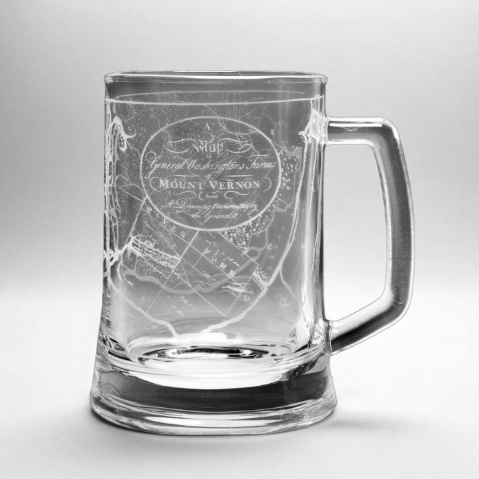 Raise a toast to history with this elegant glass beer tankard, beautifully etched with a historic 18th-century map of George Washington’s five farms at Mount Vernon. The intricate design is adapted from an original survey commissioned by General Washington himself, showcasing River Farm, Dogue Run Farm, Union Farm, Muddy Hole Farm, and Mansion House Farm.