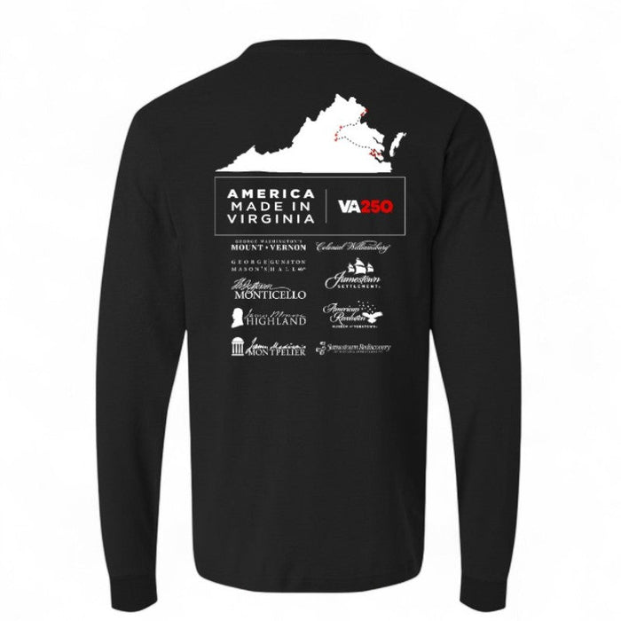 This 100% cotton long sleeve shirt features a unique road trip-inspired design showcasing all 9 Historic Museums on one side and the official VA250 logo on the other.