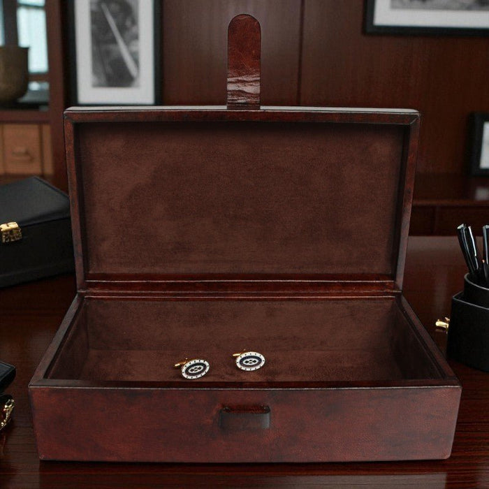 • Materials: Leather, suede fabric lining, MDF core, zinc metal hardware