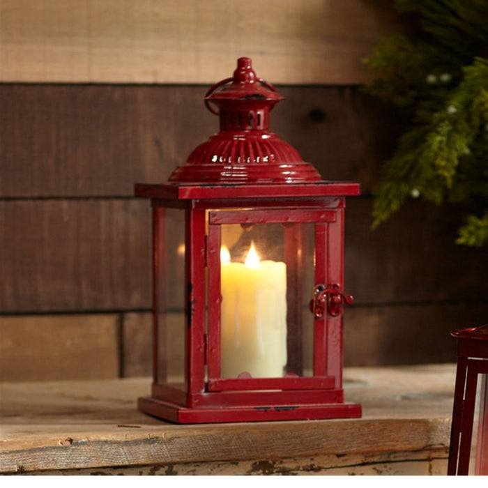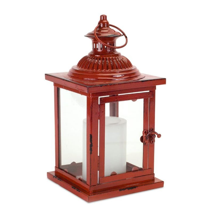 Add vintage charm to your space with this rustic-style lantern, featuring a timeworn red finish and distressed detailing that adds character to any setting. Crafted with a square metal frame and clear glass panels, the lantern is designed with intentional paint variations and areas that appear gently worn—capturing the beauty of age and use.
