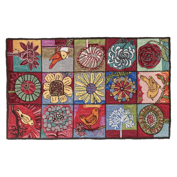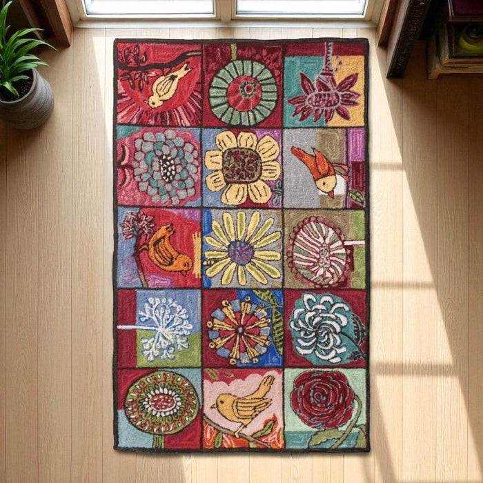 Crafted with care, our Bloomer Rugs are hand-hooked from 100% wool and feature a durable cotton cloth backing. These vibrant rugs showcase abstract birds and flowers, each meticulously detailed to bring a touch of whimsy and elegance to your space.