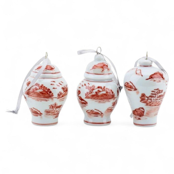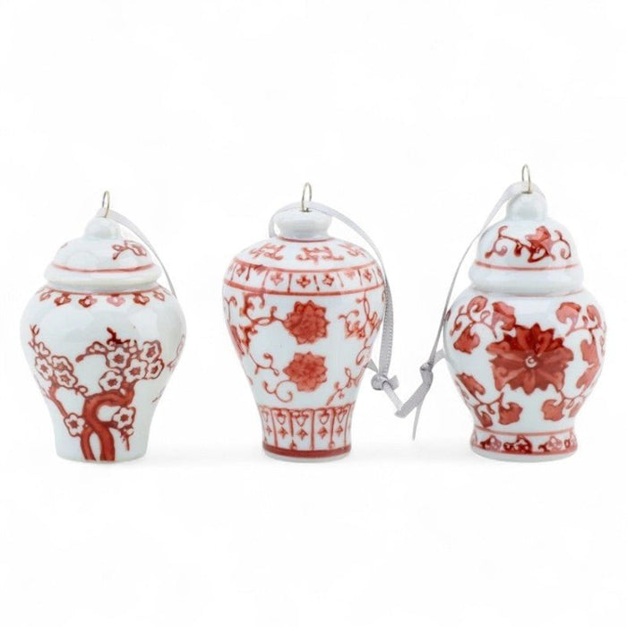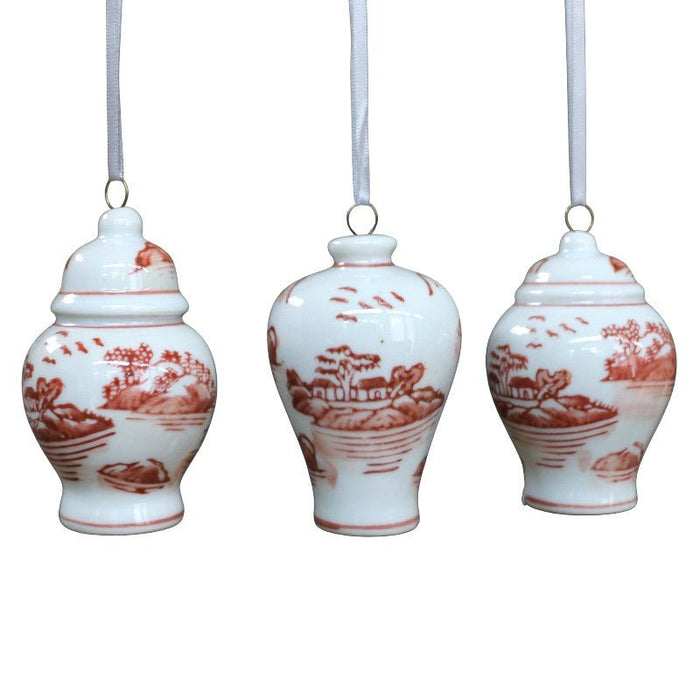 Add timeless charm to your holiday décor with this set of three red and white porcelain jar ornaments. Inspired by traditional ginger jar designs, each ornament features intricate chinoiserie-style patterns in a striking red on white glaze.