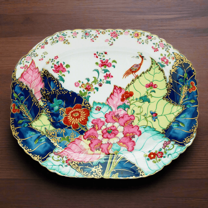 A small phoenix bird perches on the vibrant leaves of the flowering Nicotiana (Tobacco) plant. Richly decorated with twenty-seven colors and accents of 22k gold, the design is based on an original now displayed at the Metropolitan Museum of Art.