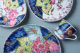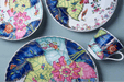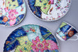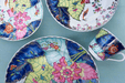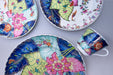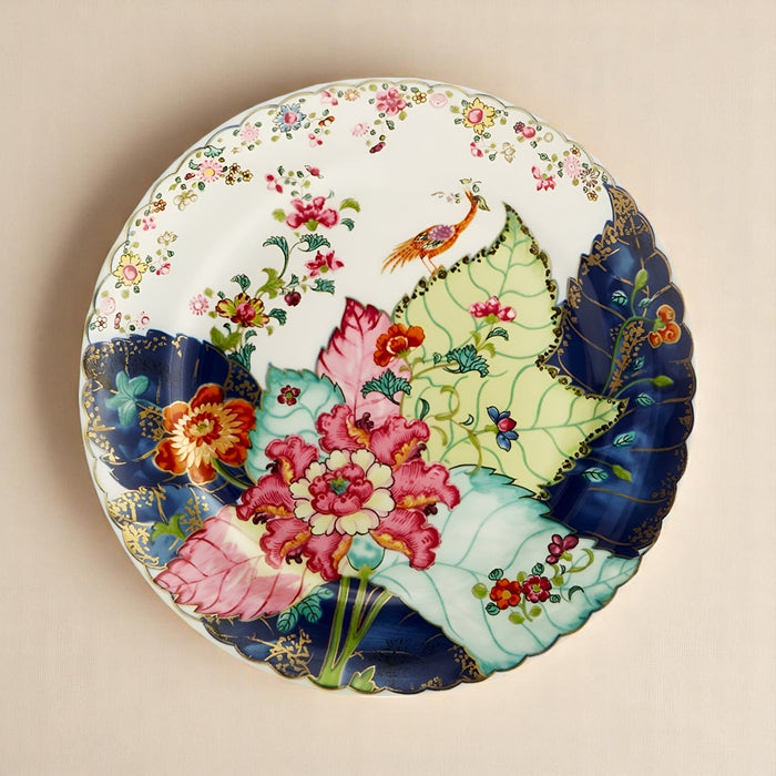 A small phoenix bird perches on the leaves of the flowering Nocotiana (Tobacco) plant. Twenty-seven colors with 22k gold characterize this pattern which is based on an original which is displayed in the Metropolitan Museum of Art.