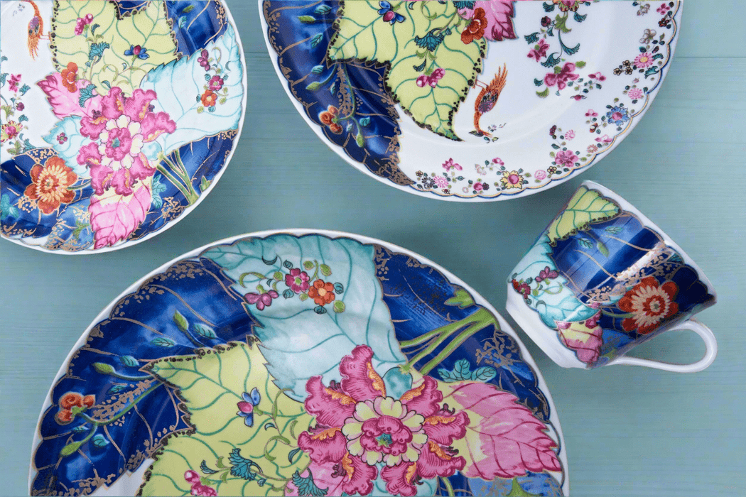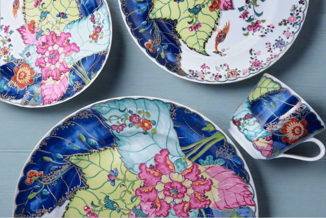 This extravagant design was originally made in China, probably for export to the Portuguese and Brazilian markets. Of all the 18th century dinnerware patterns, this was the most highly prized. George and Martha Washington owned pieces of this pattern and there are examples of Tobacco Leaf china in the Mount Vernon collection.