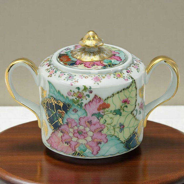 This exquisite sugar pot features the iconic Tobacco Leaf design, one of the most highly prized patterns of the 18th century. Originally crafted in China for export to the Portuguese and Brazilian markets, this intricate motif was also favored by George and Martha Washington—examples of their pieces are part of the Mount Vernon collection.